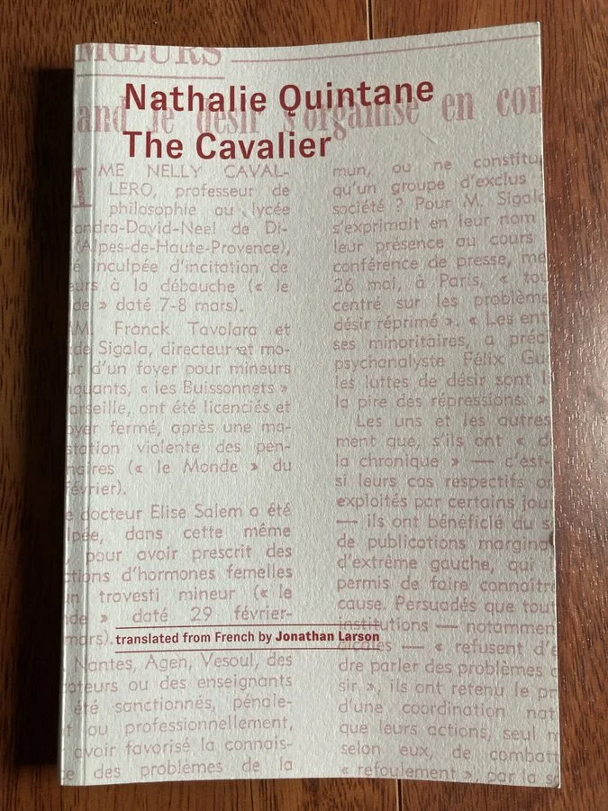 The Cavalier, Nathalie Quintane, translated by Jonathan Larson (Winter Editions, 2025) Indescribable prose, in an indeterminate genre.